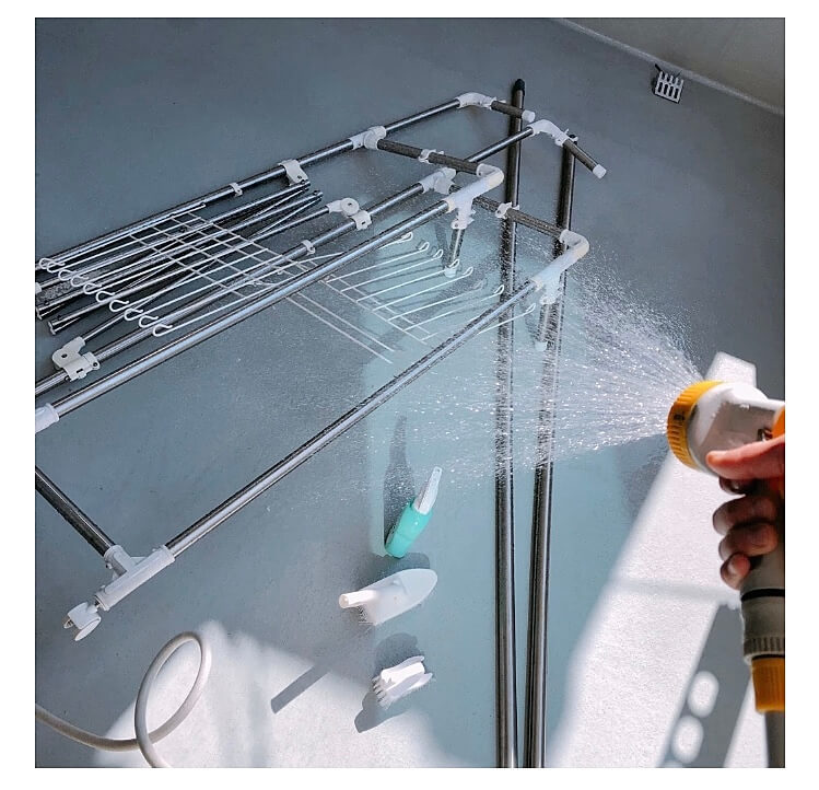 ある程度床が綺麗になった所で、物干しにシャワーをかけてウタマロクリーナーでゴシゴシ洗います。
