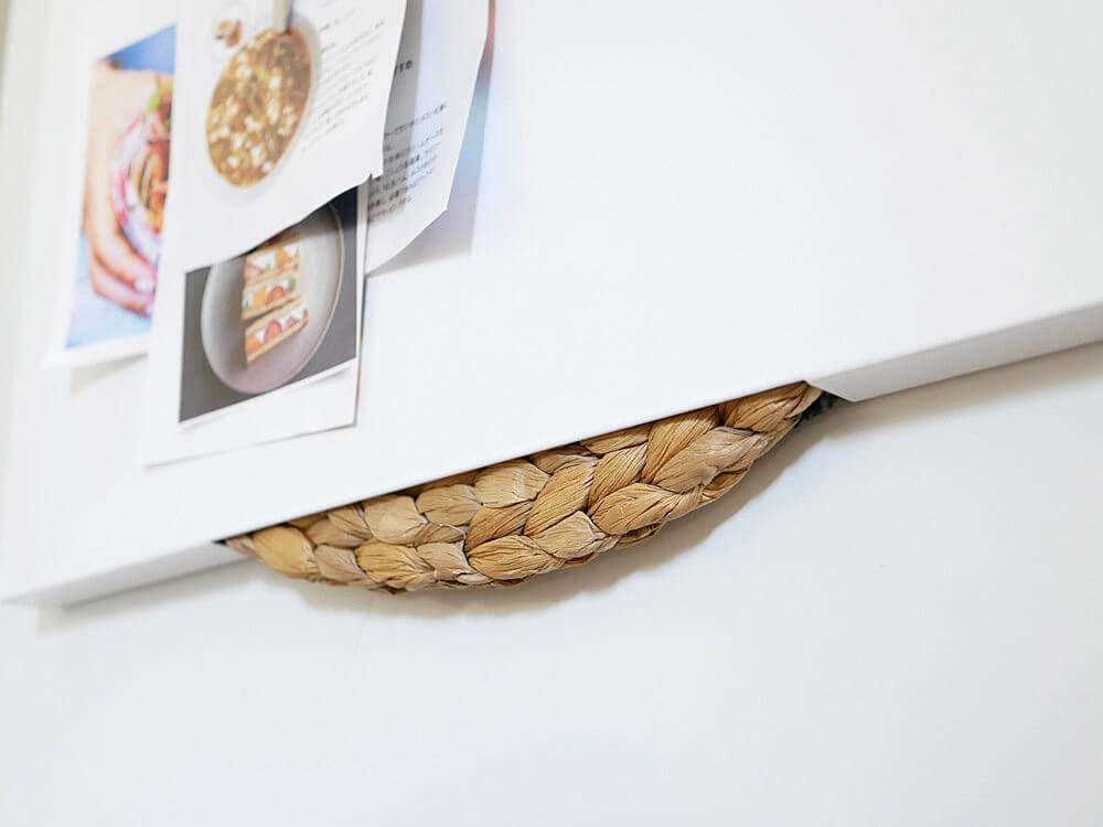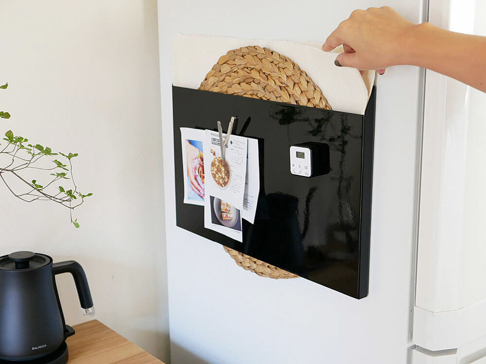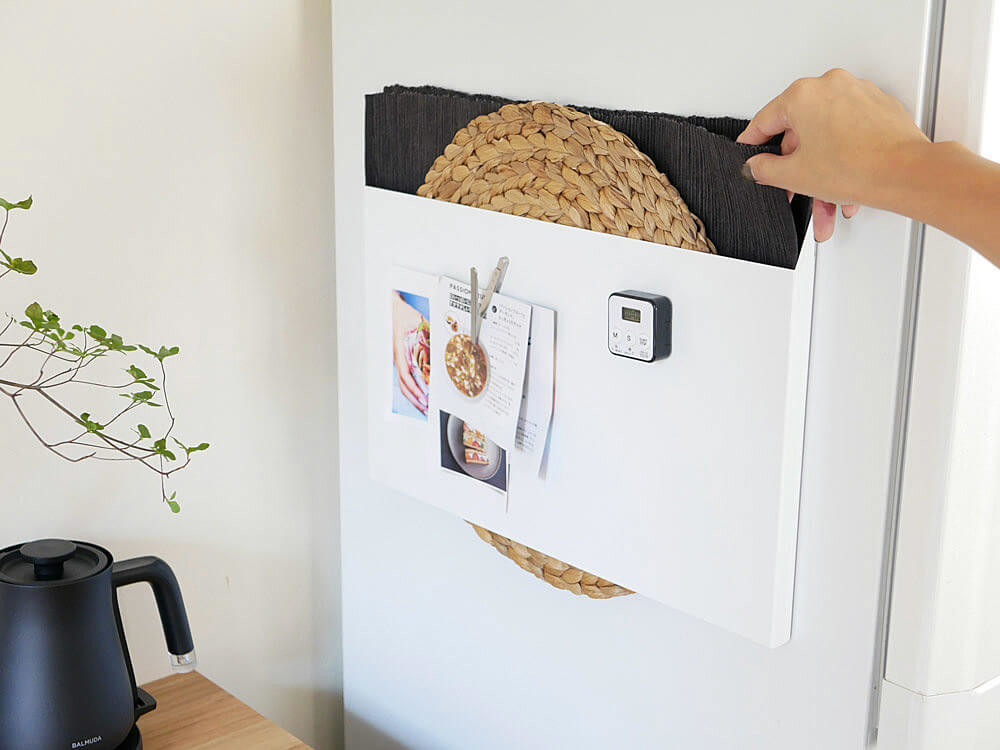 このフォルムなら書類やファイルもさっと差し込んで収納できそうですね。子どもたちが持ち帰るお便りなどで、冷蔵庫の側面がぐちゃぐちゃという方にも実はおすすめの1品なんです。