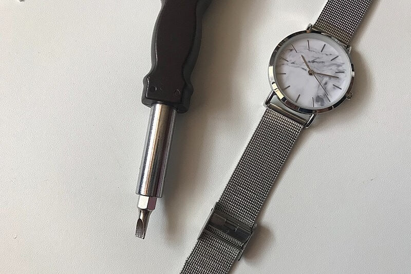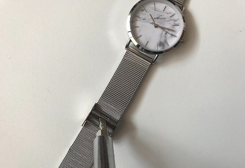 メッシュメタルバンドの調節方法も簡単です。まずマイナスドライバーなどの工具を使って留め金プレートを開きます。