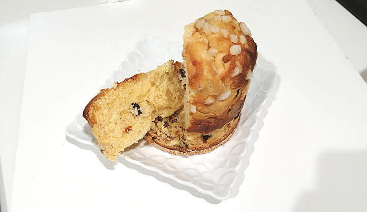 カットしてみるとこんな感じ。 甘さ控えめのふわっふわの生地の中には砂糖・洋酒漬けしたオレンジピール・レーズン・チェリーがたくさん入ってアクセントになっています。