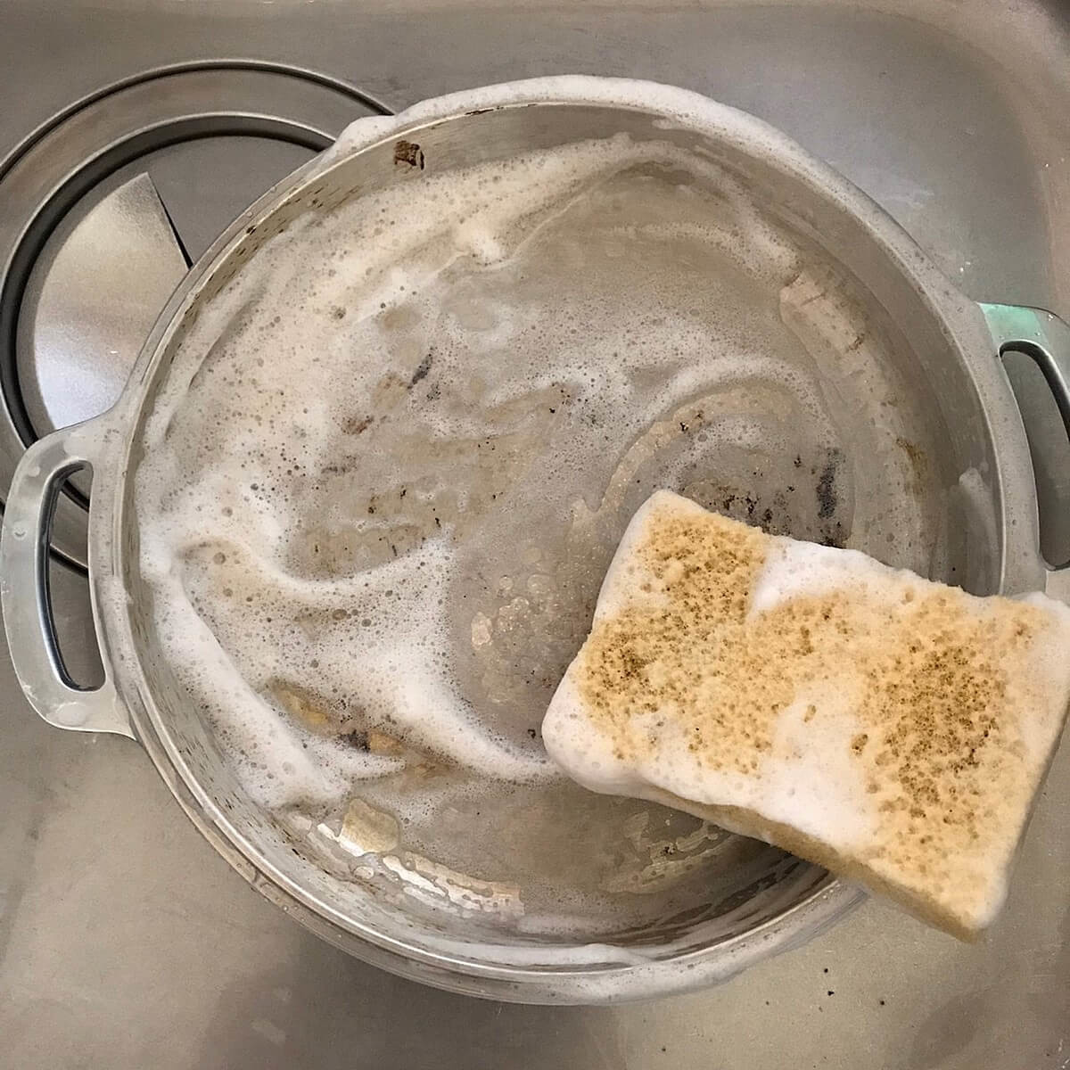 コツは、お鍋がまだ温かいうちにお湯で汚れを浮きあがらせてから洗うこと。温かいうちなら殆どの汚れは綺麗に落ちます。