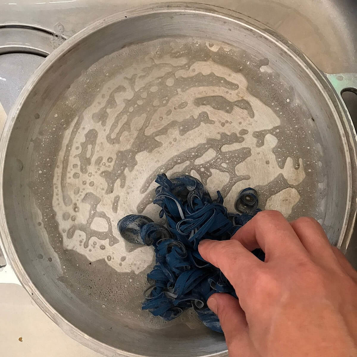無水鍋®と台所用スポンジをぬるま湯で濡らし、スポンジに石鹸クレンザーを付けて磨きます。