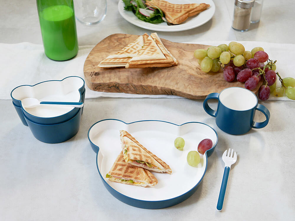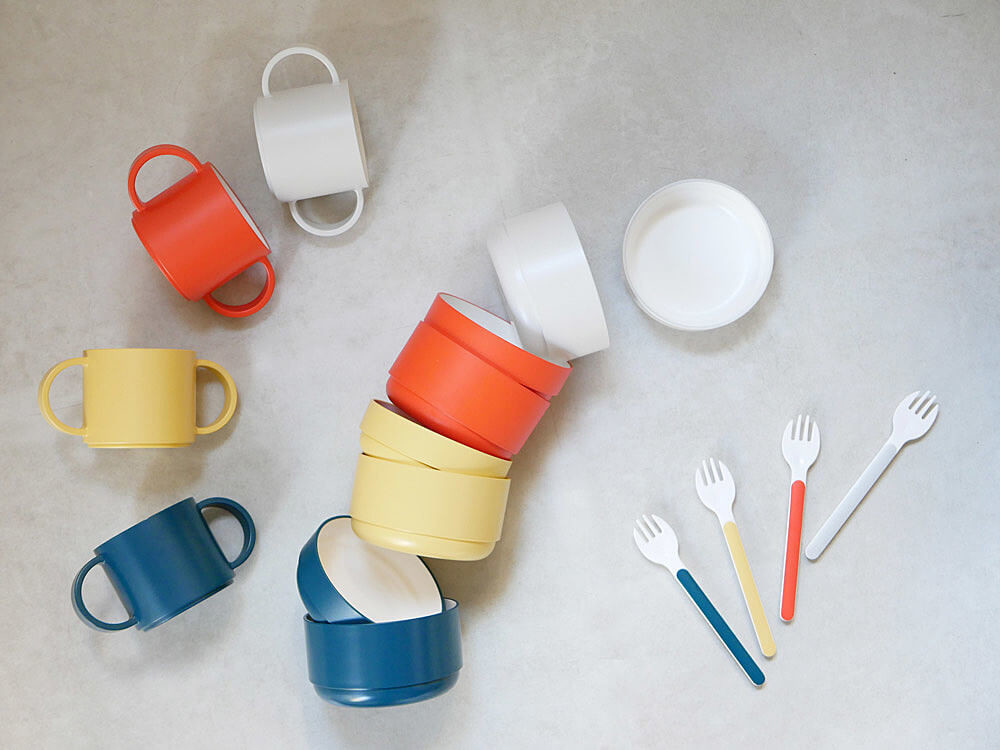 朝昼晩の食事にも、おやつタイムにも活躍する、プレート、深さの異なる2種のボウル、2つの持ち手が便利なカップの人気の4点セットに、小さな手にぴったりのスプーンとフォークが新しく加わり、同色6点がセットになって嬉しいギフトボックスになりました。
