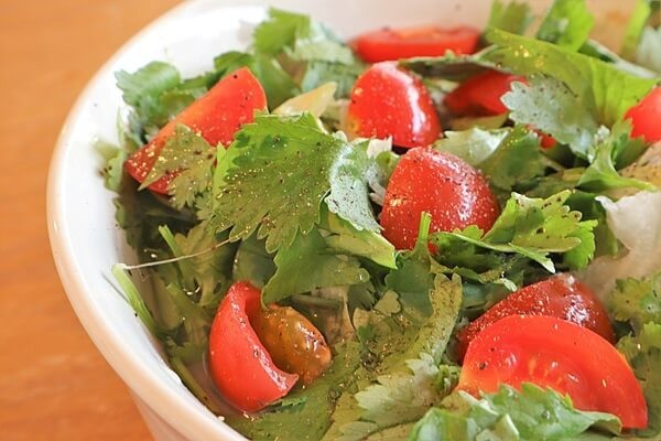 パクチー、レタス、プチトマトを盛り付けて完成。