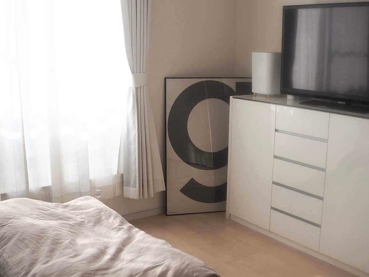 寝室は1日の疲れを癒すための場所。くつろげる空間、ゆったりと体を休める空間作りのために、寝室は出来るだけモノは置かないように心掛けています。