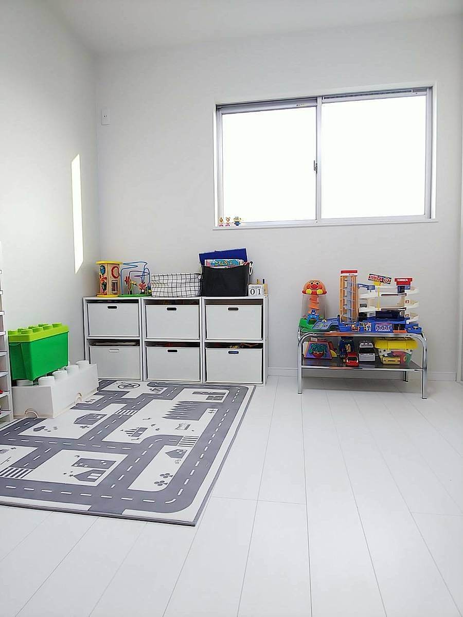 あちこちに収納を作らず部屋の一角にまとめておもちゃスペースを作る