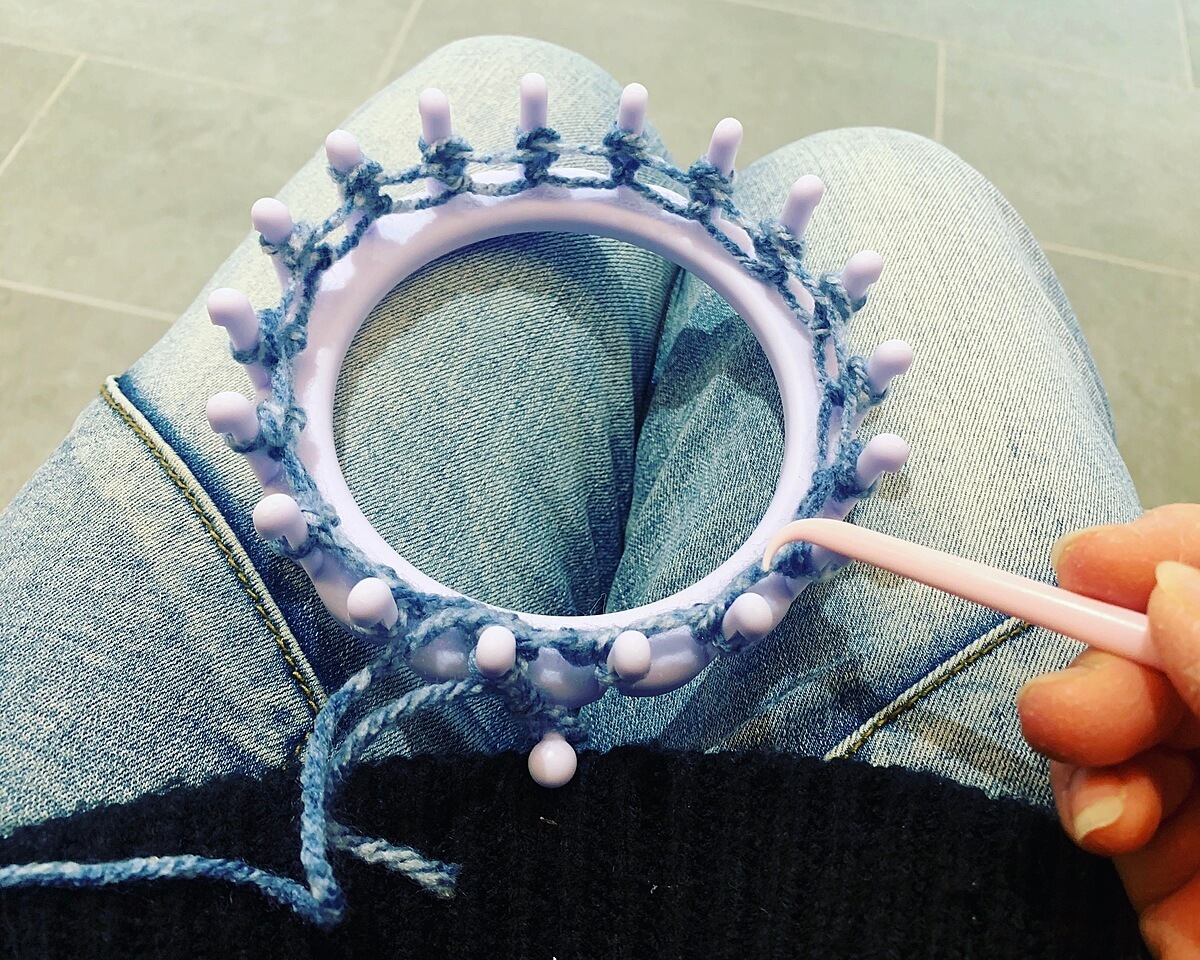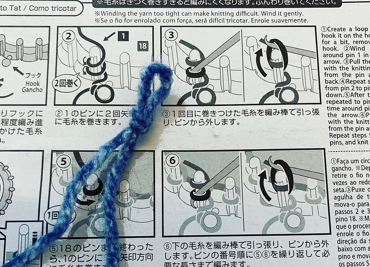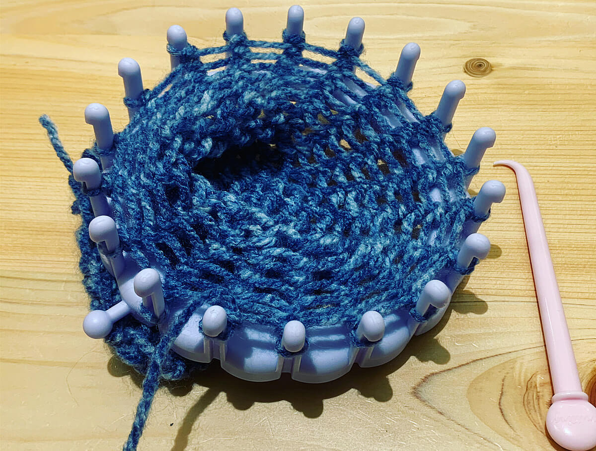 1〜18番までのフックに毛糸を引っ掛けて編んでいきます。昔、小学生の頃流行ったリリアンと同じ編み方だなぁ~と懐かしみながらの作業です。