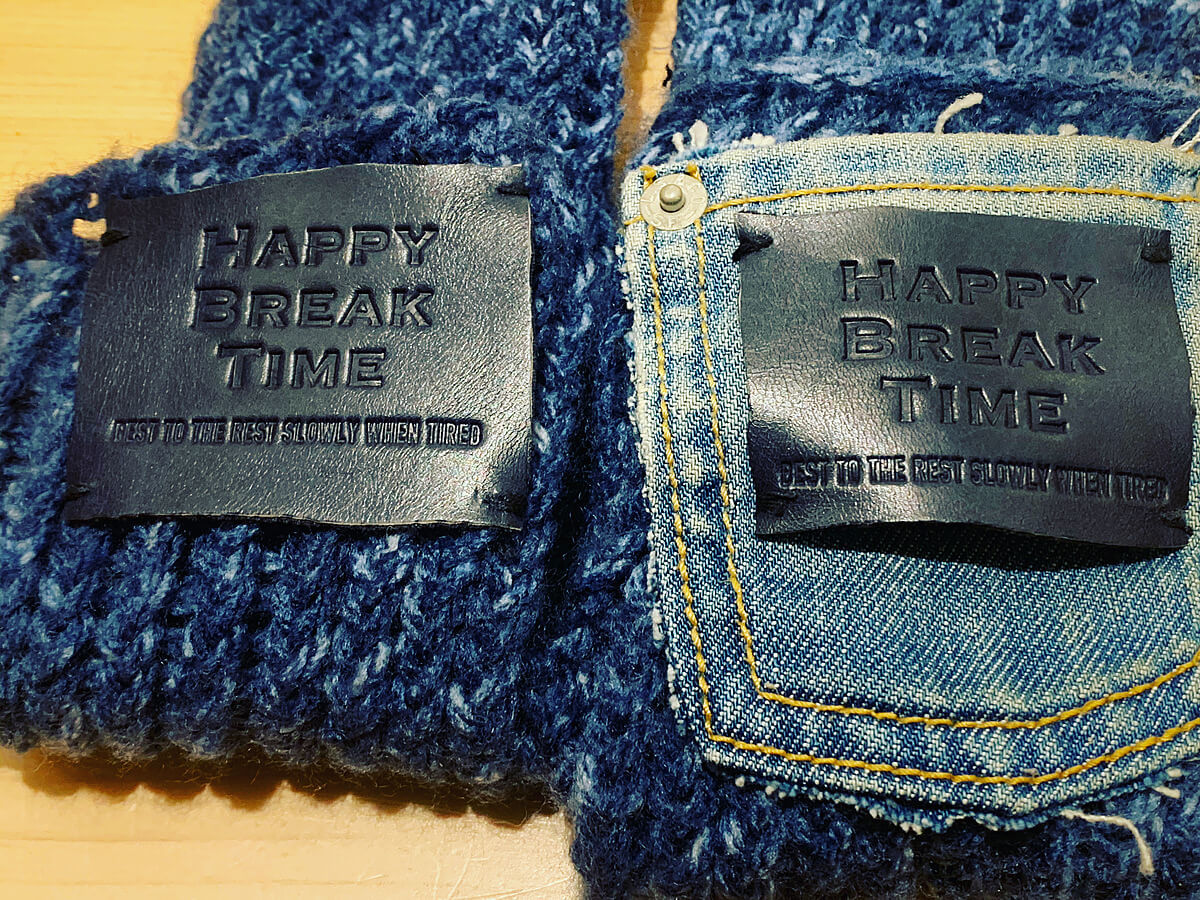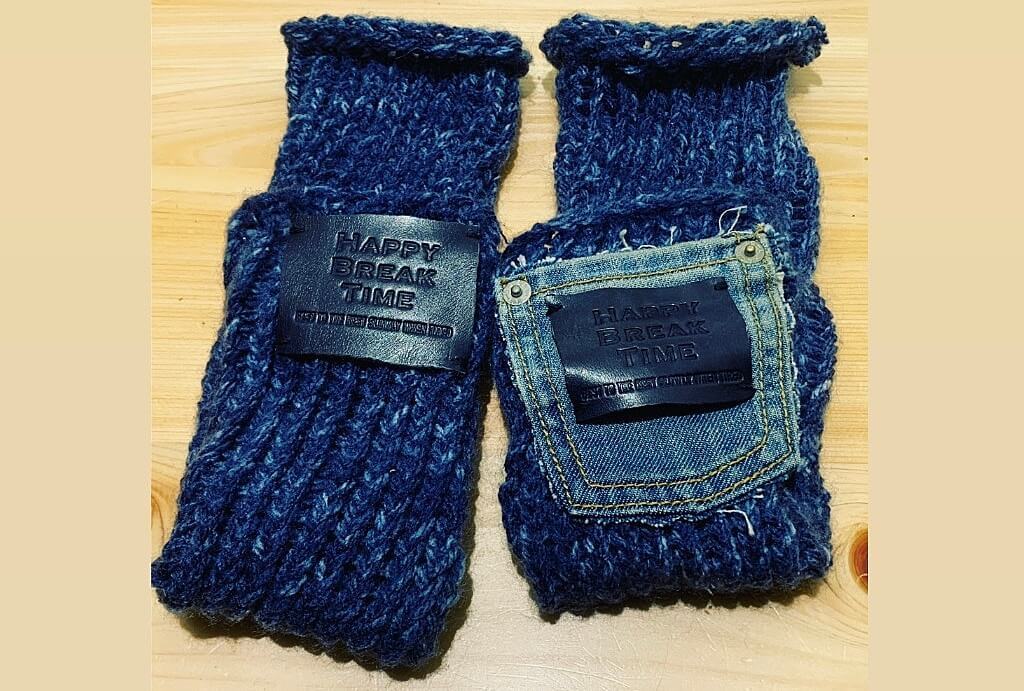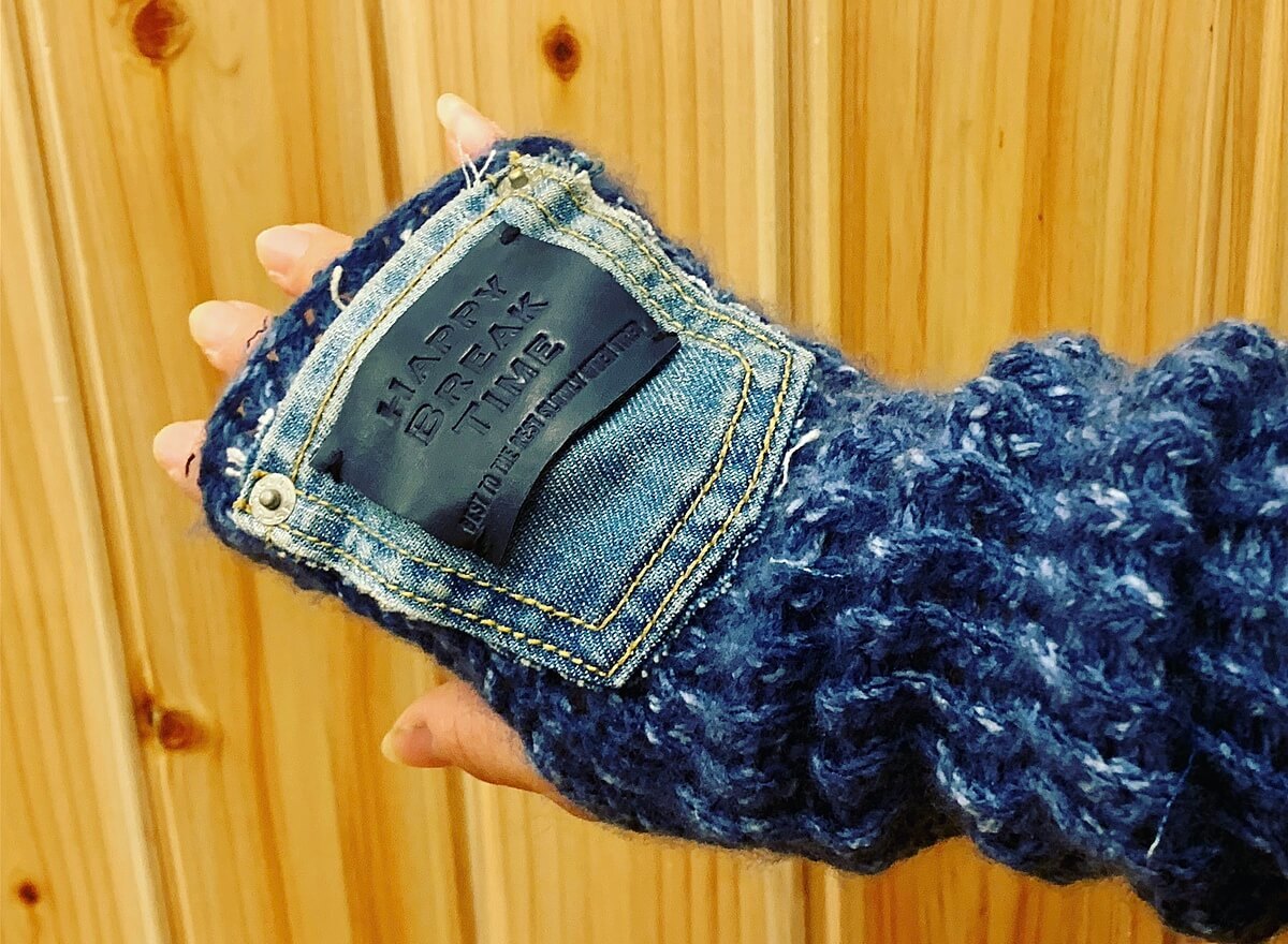シンプルなアームウォーマーに古着のデニムのポケットを右手の方に縫い付け、ダイソーで割引商品になった4つで税抜100円の紙コップスリーブをカットして、ワッペンの様にポケット同様縫い付けました。