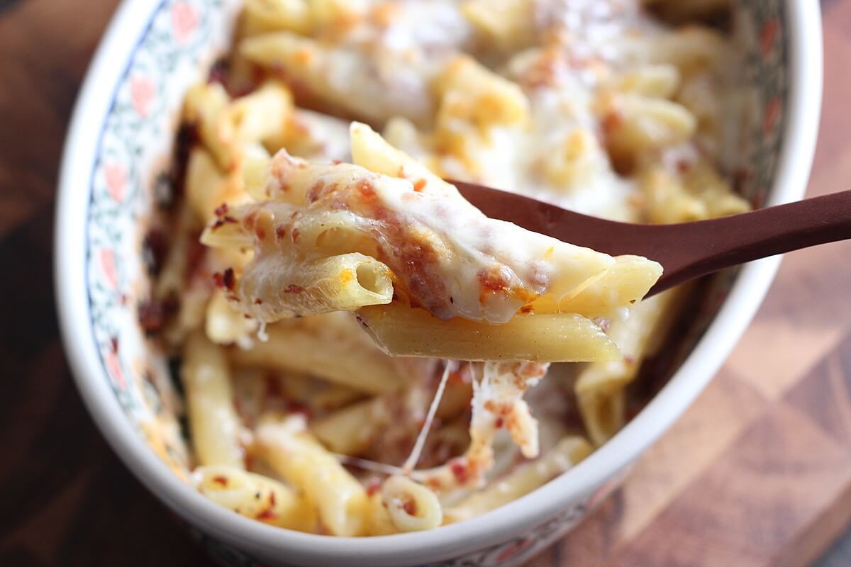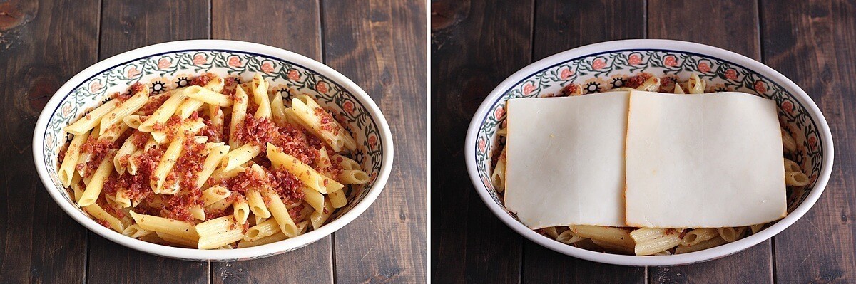 茹でたペンネをオリーブオイルで炒め、ガーリックや塩コショウ、シーズニングなどで味付けしたものをポークジャーキーと和えて耐熱皿に入れ、チーズをのせてオーブントースターで焼きます。
