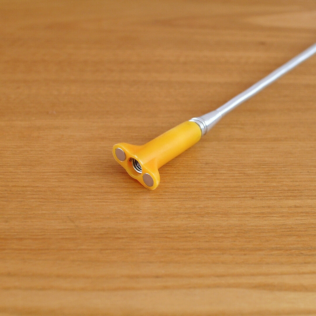 先端の形状はこのようになっていて、マグネットが2つ付いています。ネジなど金属製のモノは、このマグネットでキャッチすることができます。