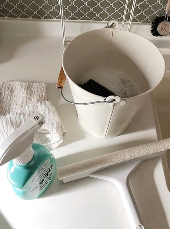 ウタマロ(もしくは中性洗剤)の量は、だいたい水:ウタマロ=4:1くらいの割合で、ざっくり混ぜています。後で磨く時に泡立ちが少なければ、洗剤をプラスするくらいで大丈夫です。