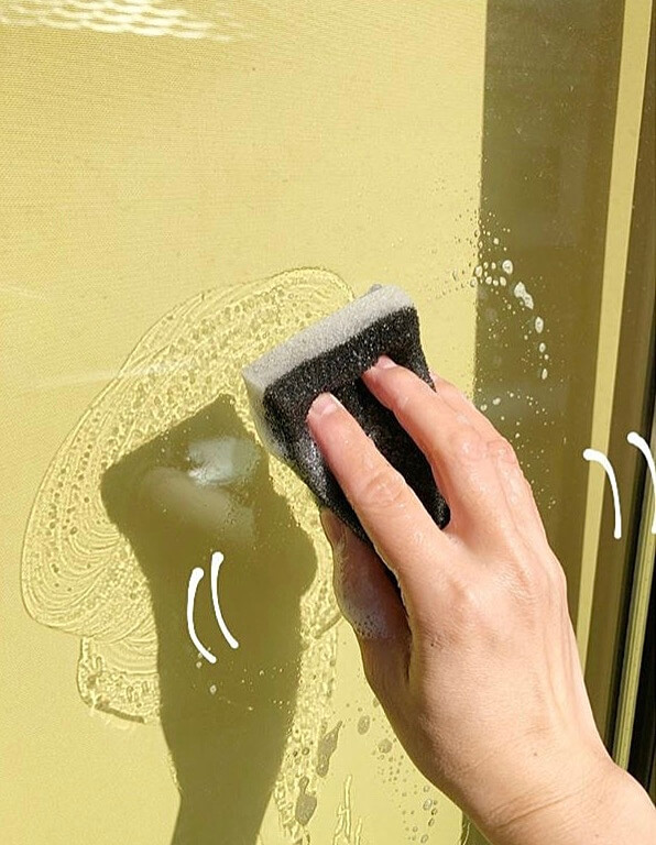 ウタマロ水をスポンジに含ませながら窓を磨く
