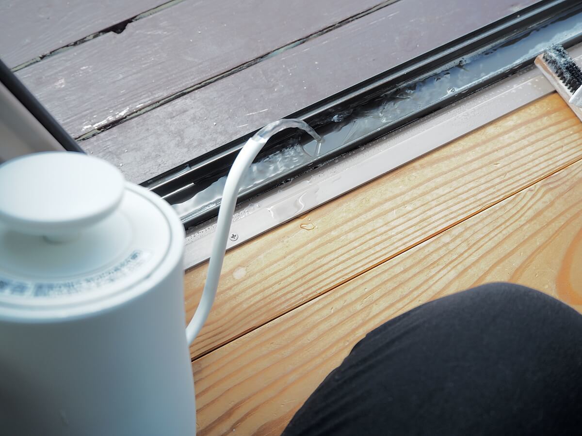 綺麗に磨けたら水を流します(細口のケトルがここで大活躍)。