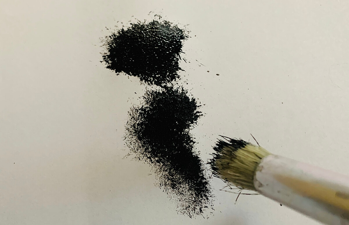 筆の先にペンキをつけたら雑紙などに無駄なペンキを落とします。筆を垂直に立ててポンポンと叩くようにするのがポイントです。