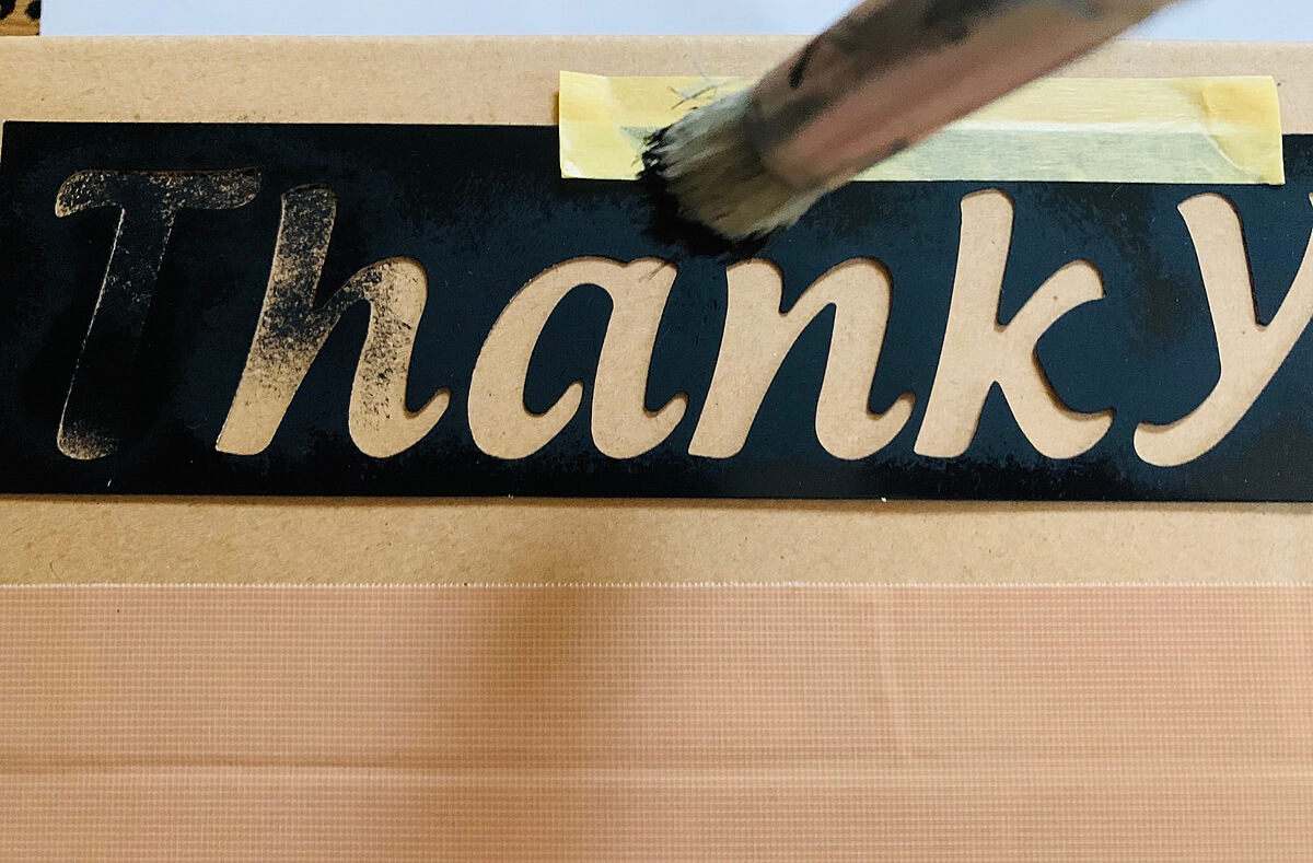 早速、ウェルカムバージョンAを段ボール箱にステンシルしてみましょう。 100均で売っているステンシル専用の筆を使って作業します。
