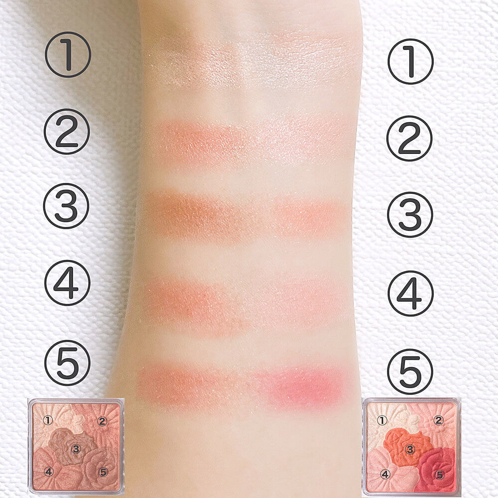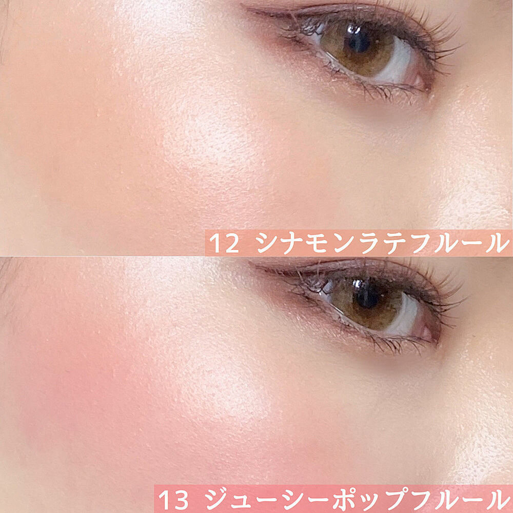 限定色「No.13 ジューシーポップフルール」はジューシーなピンクやコーラル系のカラーで貼るらしい頬をつくります。(写真奥)