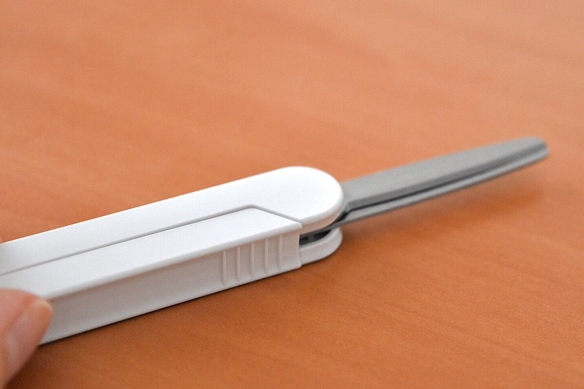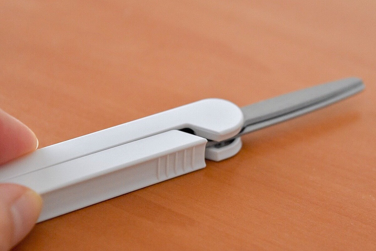それに比べて新発売したスティック型はさみはキャップがなく、使いたい時は持ち手をスライドさせてロックを解除するだけでOK。