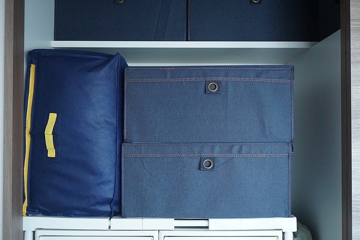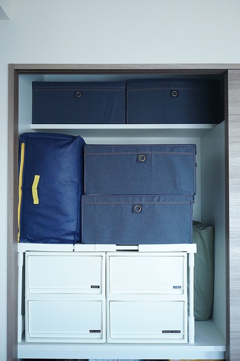 使う頻度の少ないゲスト用布団は一番上の棚に、下段には奥に2個・手前に2個収納ボックスを置いています。奥の2個には夏物布団を入れ、手前は冬物布団を入れています。