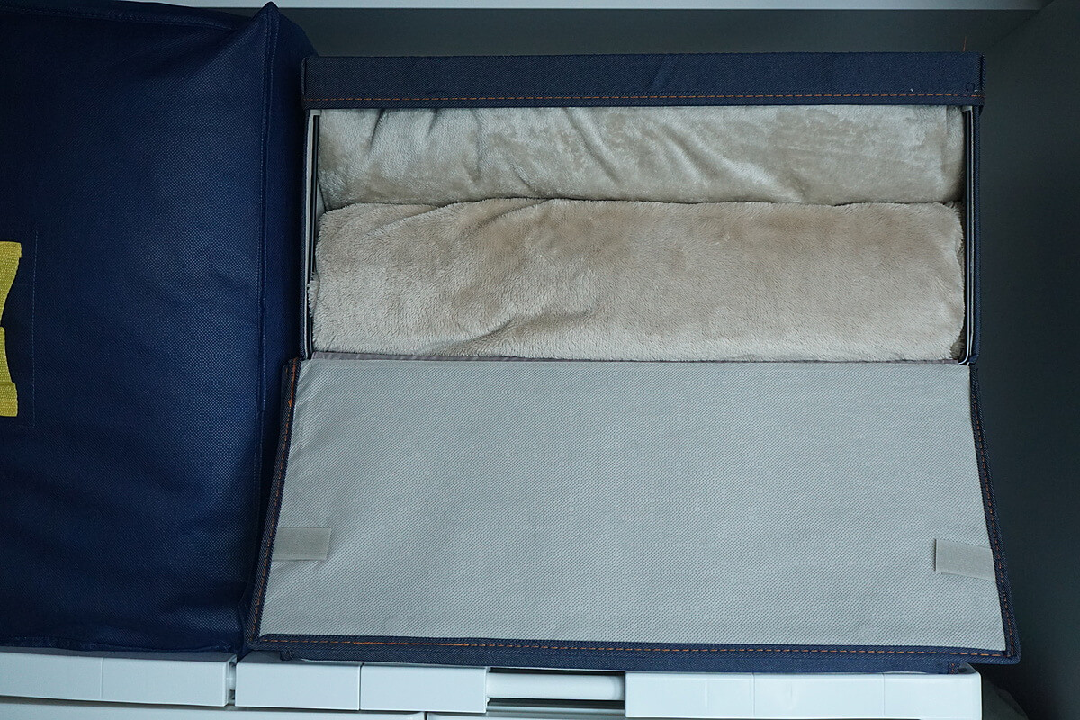 ボックスにはNウォーム毛布は2枚・ダブルブルサイズの敷パッドは2枚・夏用のタオルケットは3~4枚収納することができます。
