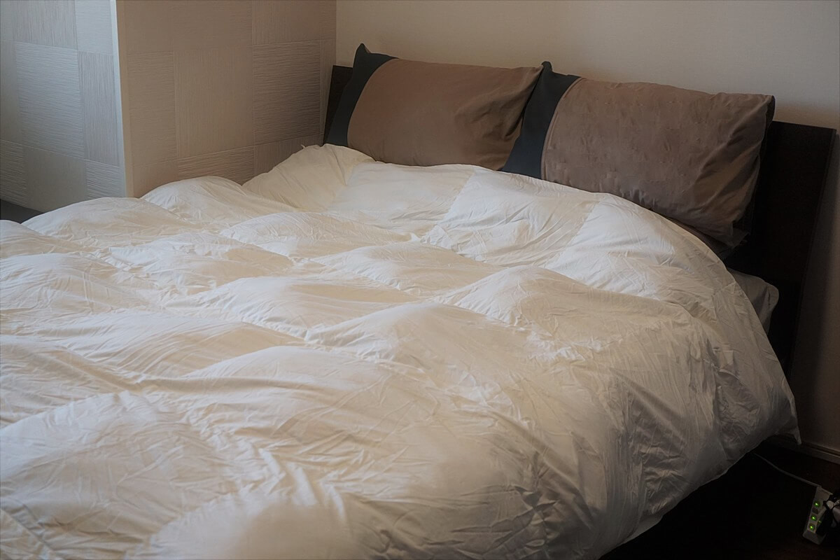 温かさ、軽さはゲスト用布団として十分満足できるレベルです!さらに厚さが5cmなので、ダブルサイズでもコンパクトに収納できます。