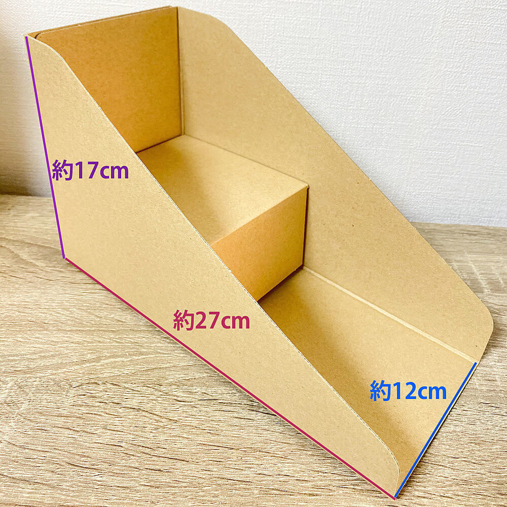組み立てた際に正面からみた幅は約12cm、奥行は約27cm、一番奥のサイドの高さは約17cm。