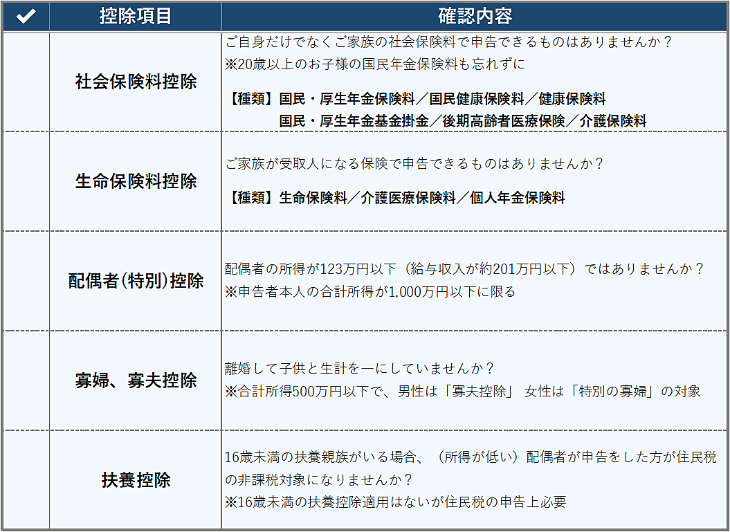 年末調整書類の提出前に以下の項目を確認し、しっかり節税対策をしましょう。