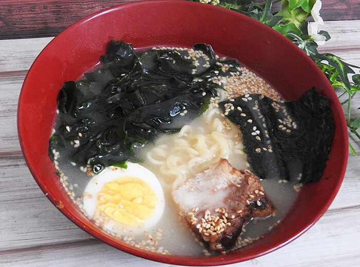 「どうにかして美味しくいただきたい」と思って試行錯誤した結果、鶏がらスープの素を入れることで落ち着きました。それからわかめや煮卵などトッピングをのせるとそれなりの味に仕上がりました。
