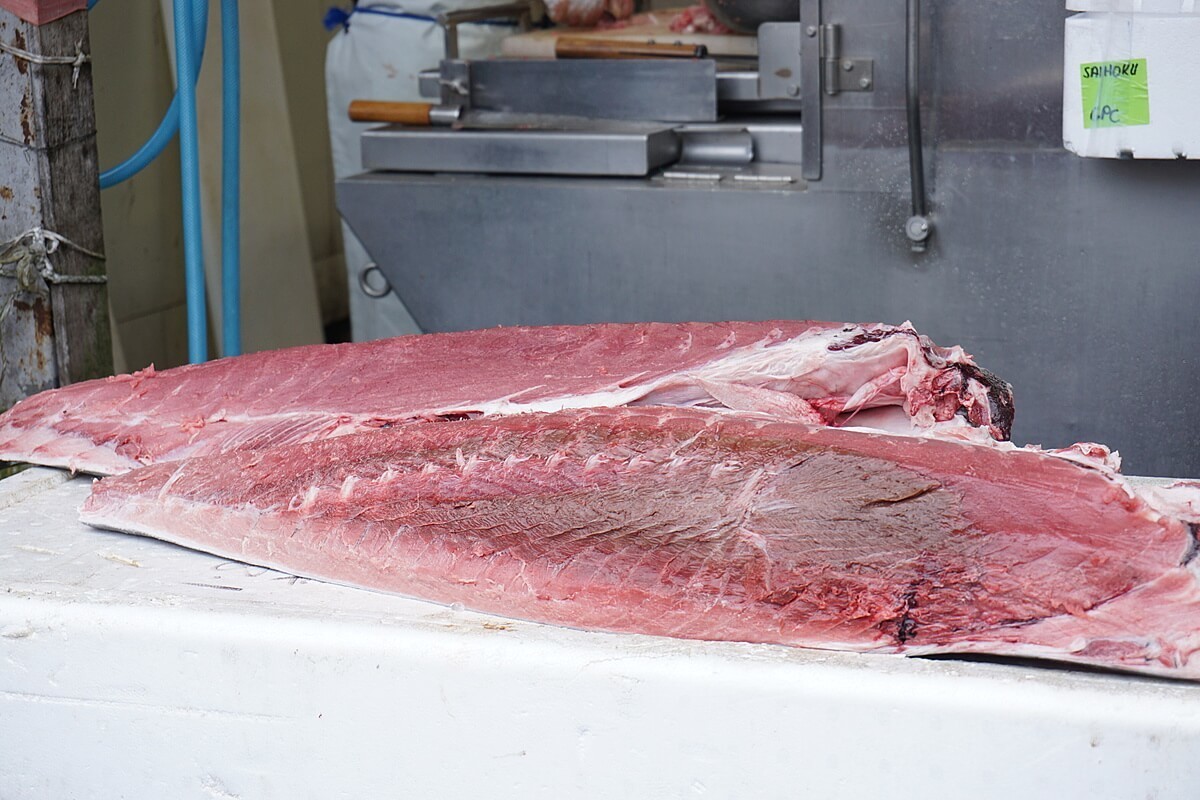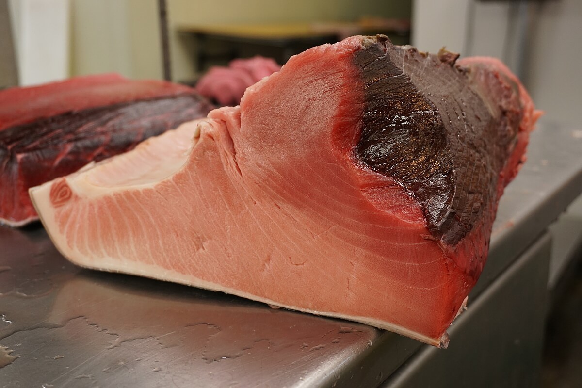 水産棟にはマグロを扱っているお店がたくさんあり、どのお店にもこのようなマグロの塊が置いてあります。