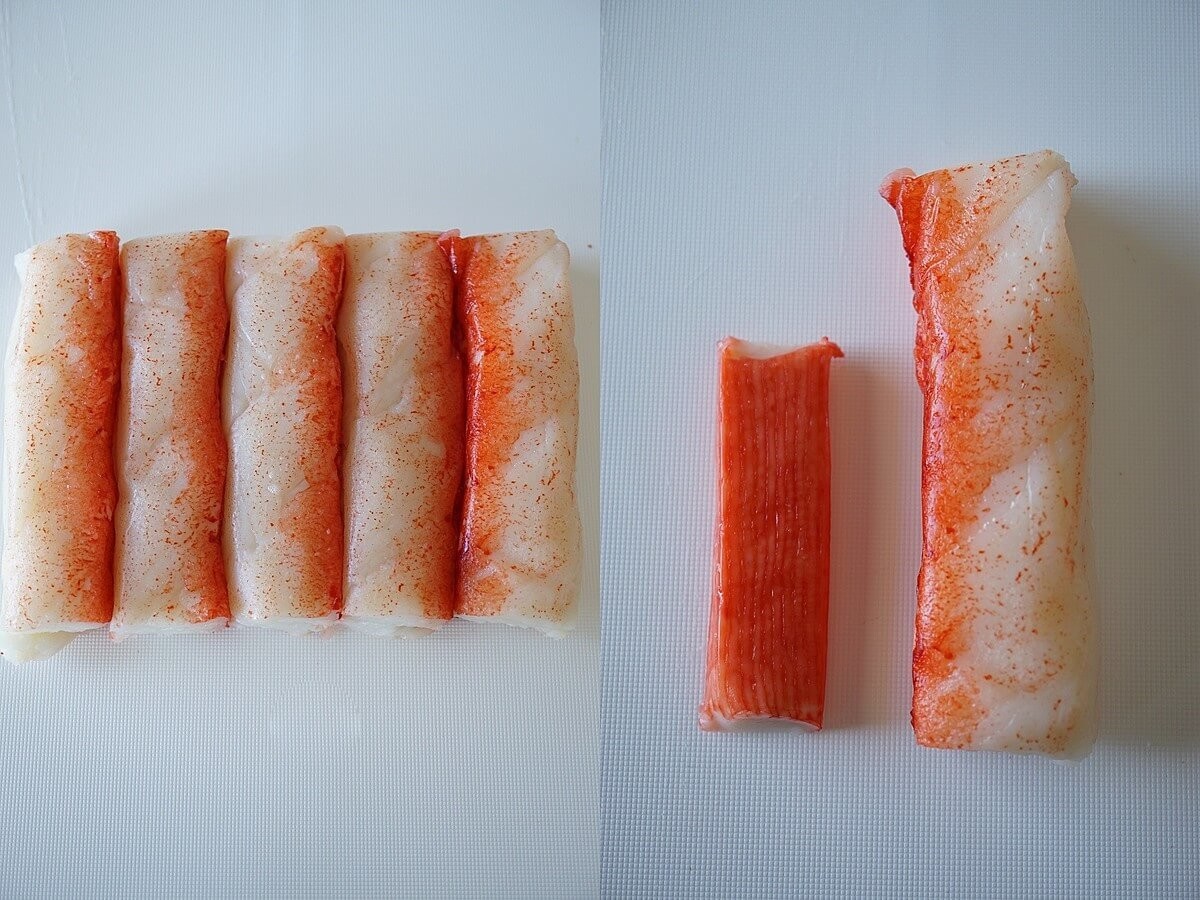 1本の長いかにかまに見えますが、真ん中でカットされていて、長さ10cmほどのかにかまが20本入っています。