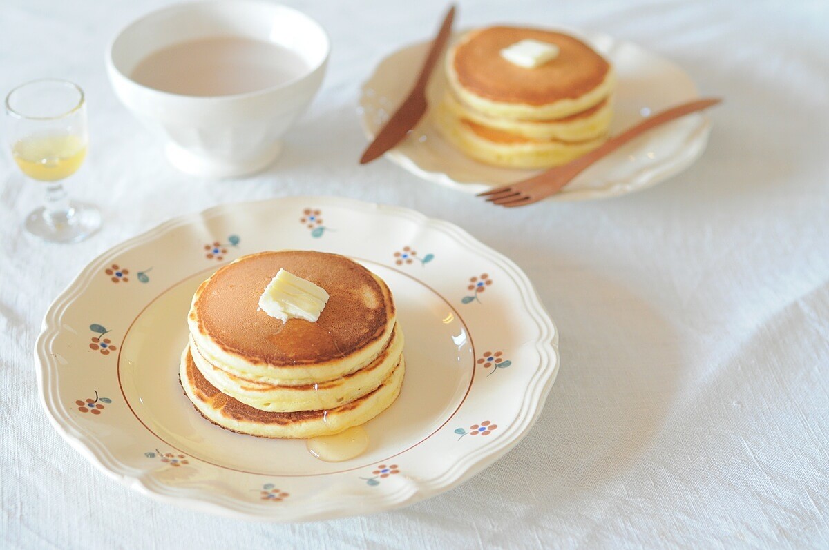 茶色い小花とパンケーキの焼き色がリンクして。手持ちの無地の同じアンティークと使えるのも気に入っているところです。