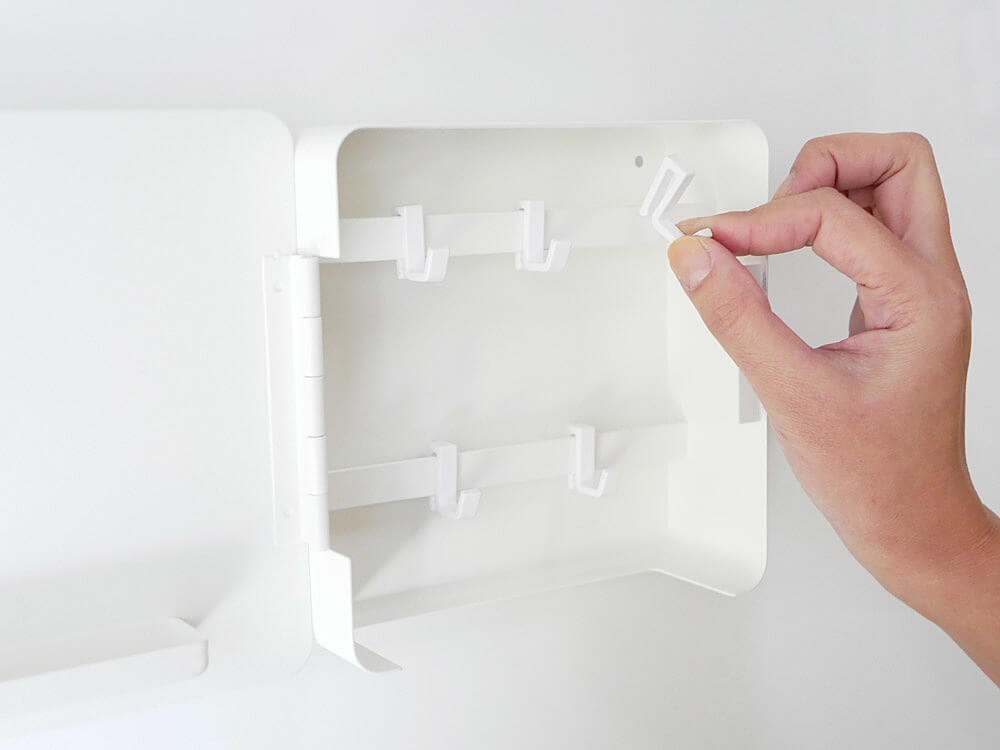 着脱できるフックが5つあるので、家の鍵、車の鍵、自転車の鍵など家族分の鍵が一括収納できます(耐荷重1kg)。