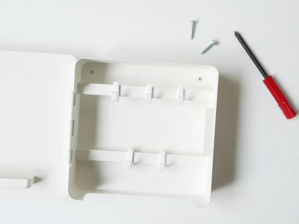 本体の内側に小さな穴が開いているので、付属の木ネジで壁に取り付けることも可能。玄関ドアだけでなく、壁面にもスマートに設置出来るのが魅力です。