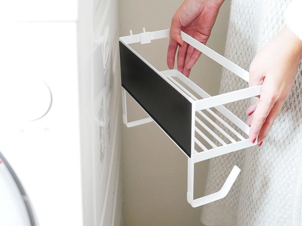 洗濯機にマグネットで取り付けることで、床から浮かせた場所に収納スペースを作ることが出来るので、ランドリースぺースの床掃除もラクに行えますね。