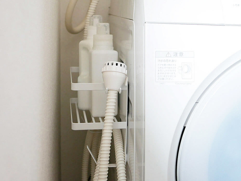置き場所に困る給水ホースや洗濯用洗剤・小物などを洗濯機の側面に一括収納!