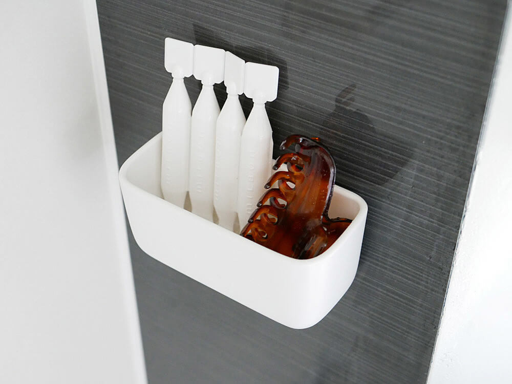 マグネット脱着で欲しいところに簡単に設置出来るので様々なニーズに答えます。柔らかいオフホワイトと丸みを帯びた優しいフォルムが特徴でどんなバスルームにも自然に溶け込んでくれますよ。