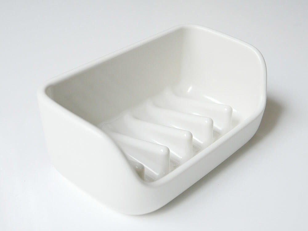 底面は傾斜しているので自然に水が切れるアイデア構造。石鹸置きは、石けんが乾きやすく、長持ちします。