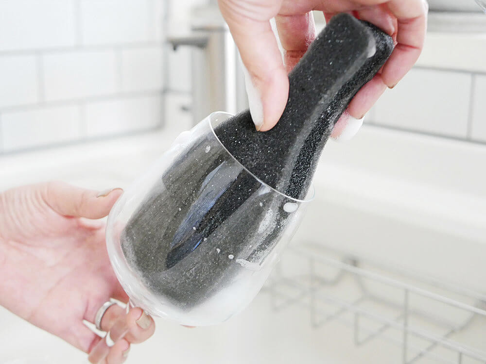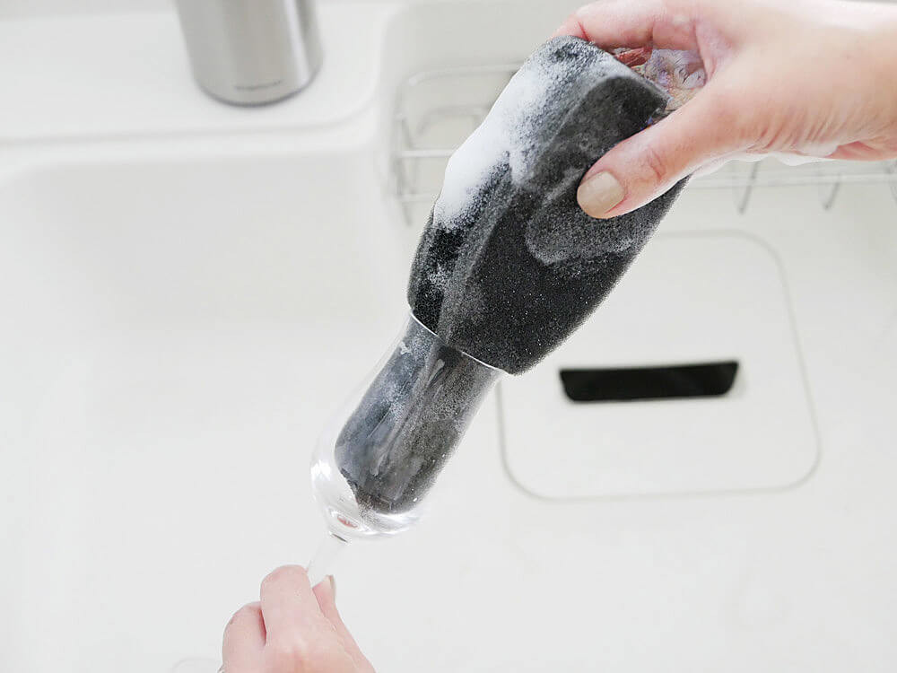 長さのあるボトル型のスポンジは、大きなグラスの底に届きやすいのもポイント。手の届きにくい底部分もきれいにしっかり洗うことが出来ます。