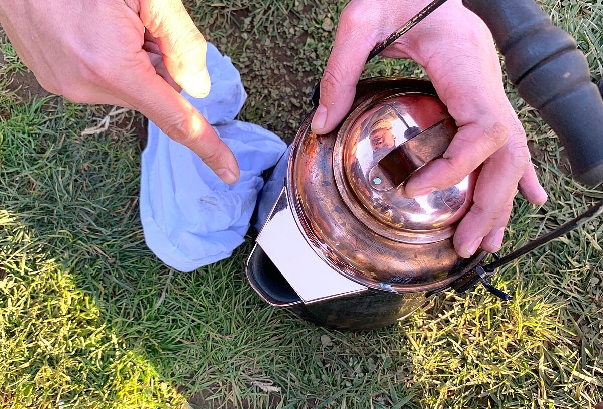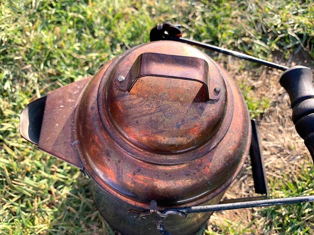 コッパーケトルのふた、注ぎ口部分を磨きます。
