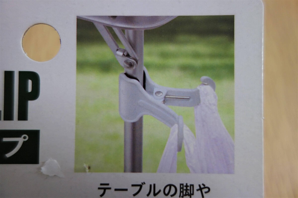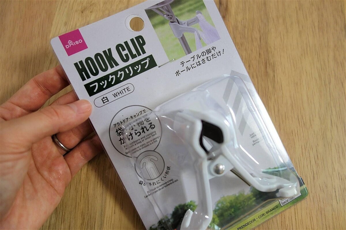便利グッズその2は、荷物かけに丁度いいフッククリップです。テーブルの脚やポールに挟んで、小物かけとして使います。