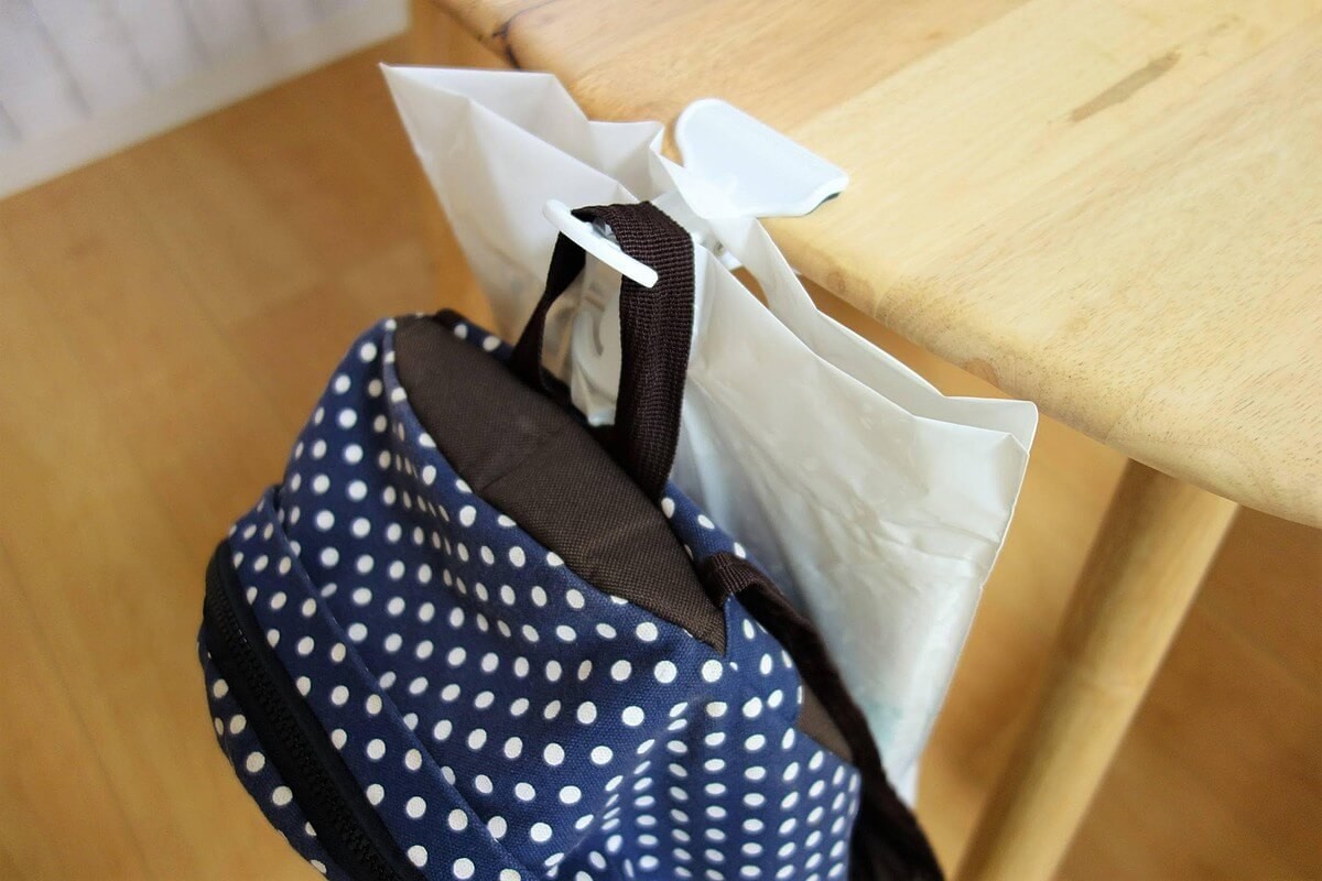 荷物置きがないレストランでも荷物が掛けられるんですよね。 (※ダイソーには荷物かけ専用のフックもあります。天板の厚みに関わらず使用したい場合は専用フックがおすすめです。)