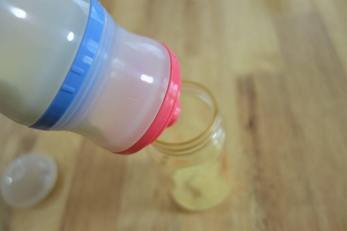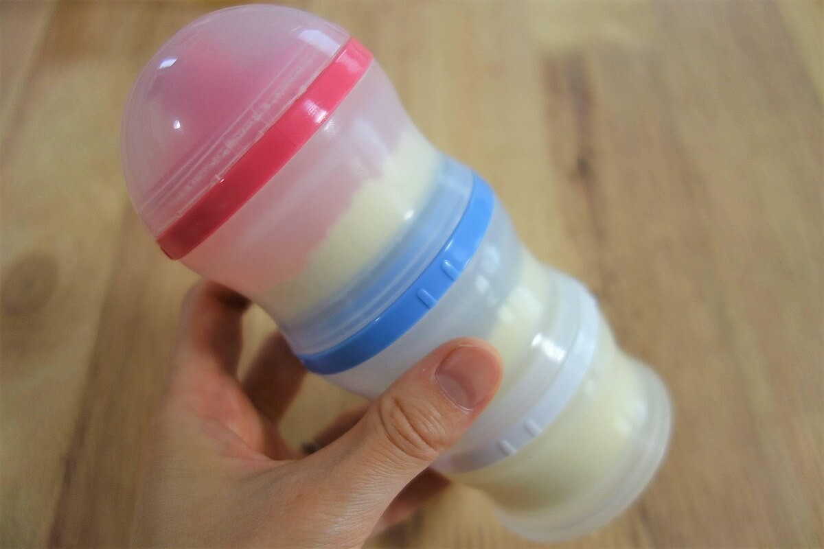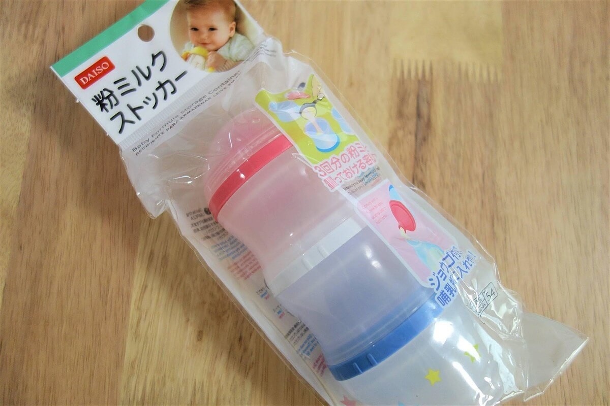 便利グッズその3は、ダイソーの粉ミルクストッカーです。これがあれば、外出先でも赤ちゃんのミルク調乳が簡単にできます。