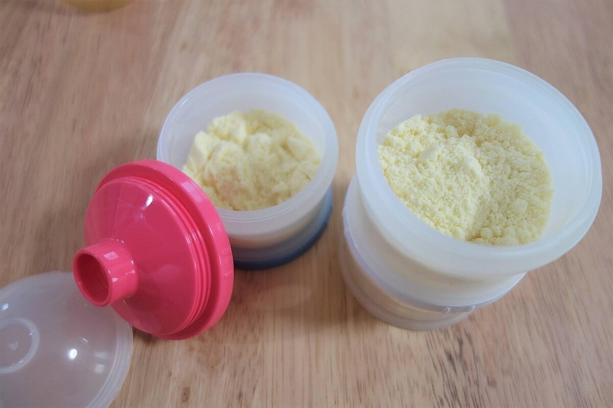 次に、それぞれケースにフタをして重ねます。このとおり、粉ミルクは3回分入ります。