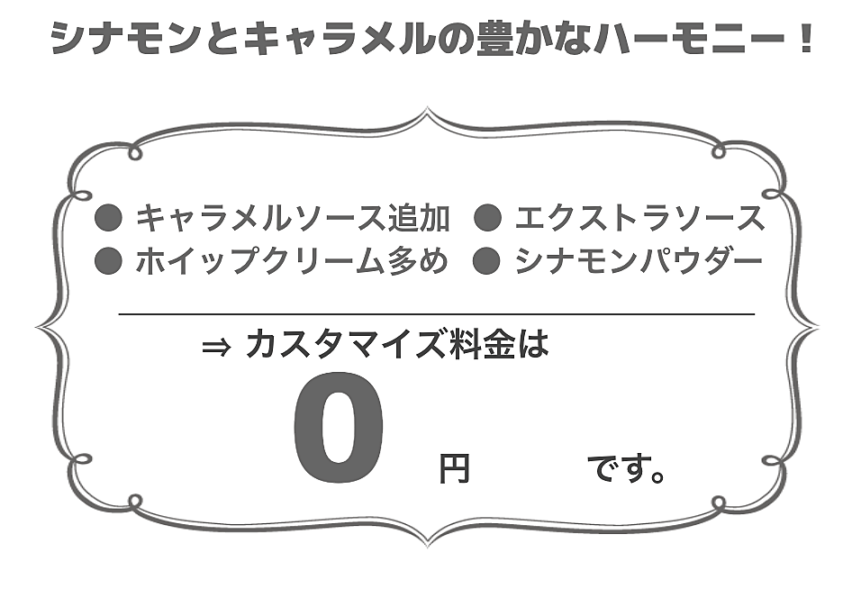 こちらのカスタマイズは、モカシロップとホワイトモカシロップを減量することで、甘さのちょうどいいドリンクに仕上げることができますよ。