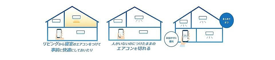 どこからでもスマートフォンがリモコンに。スマートフォンから、運転オン/オフ、風量・風向調整など、リビングからどこのお部屋のエアコンも操作できます。