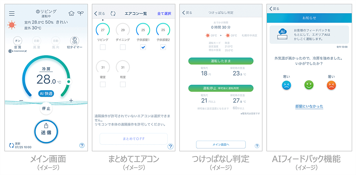今回、無線LAN内蔵機種を拡充することで、リビングのエアコンはもちろん、寝室や子ども部屋など家中のエアコン操作をスマートフォンの「エオリア アプリ」で手軽に行うことができます。