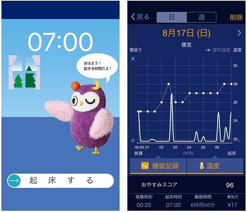 おやすみナビアプリ(別アプリ)をダウンロードし、遠隔操作設定済みの寝室のエアコンを設定いただくと、就寝から起床まで、体動に連携し、エアコンが寝室の温度を自動でコントロールすることで快適な睡眠をサポートします。