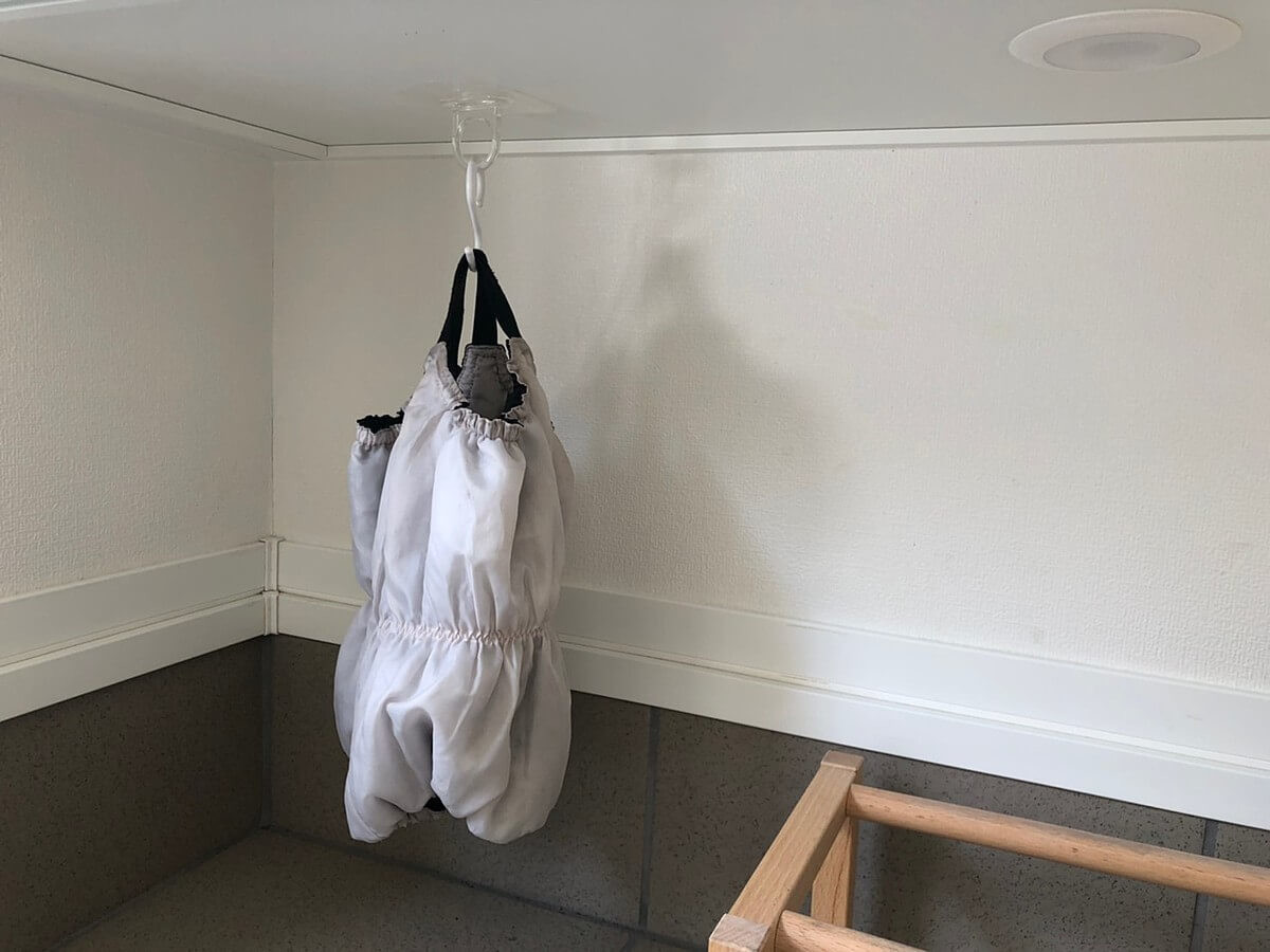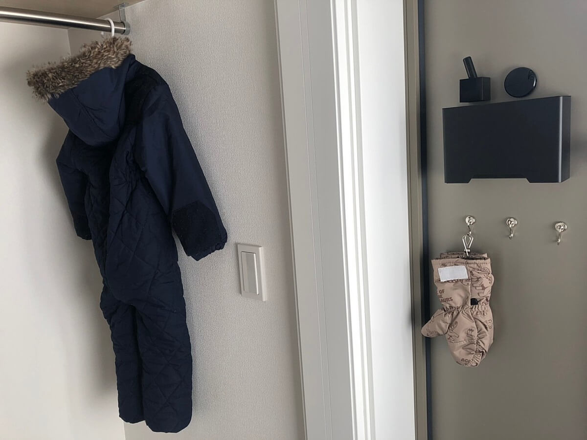 濡れてしまったスノーカバーはシューズウォールの下に吊るして乾かしています。取れにくいS字フックを使っているので子どもでも簡単に扱えるのが嬉しい。