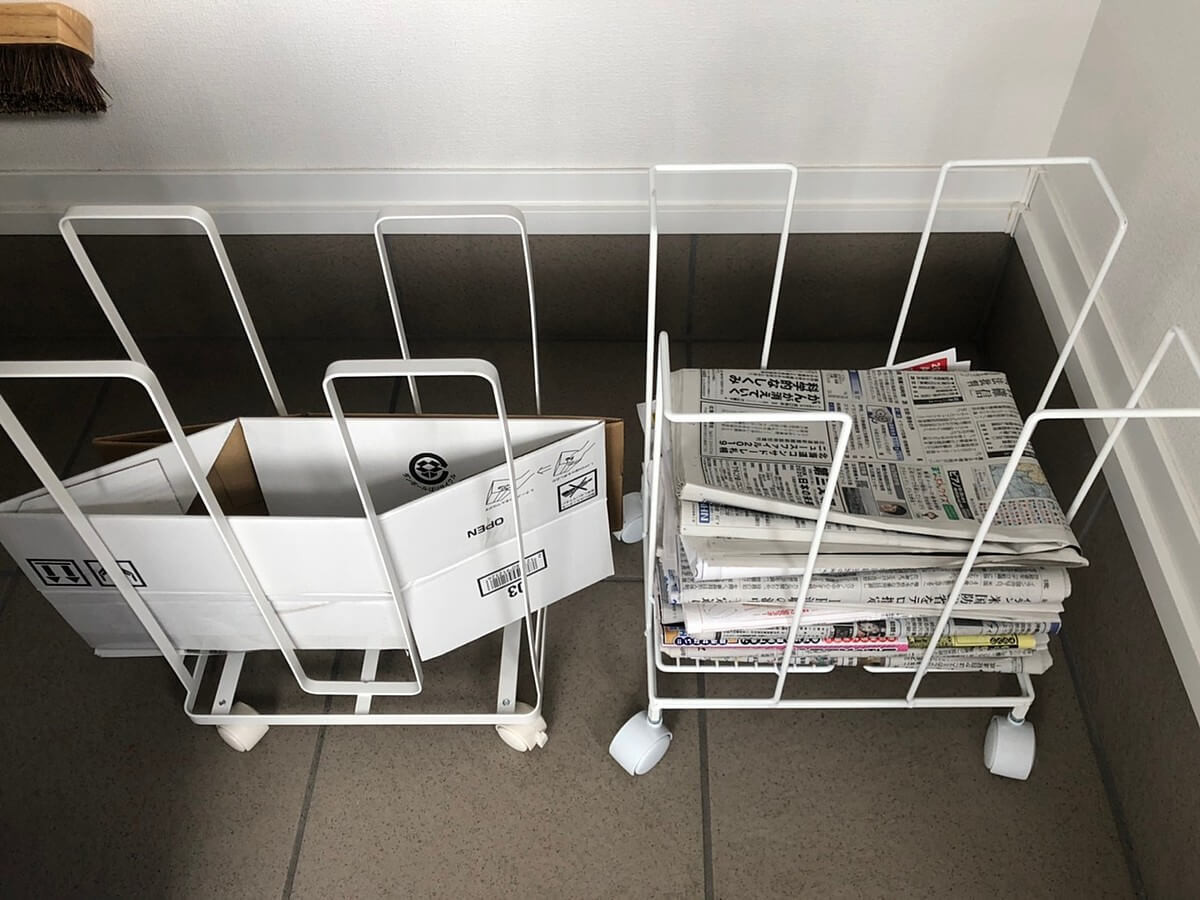 ここの中もなるべくスッキリさせるために段ボールや新聞紙はキャスター付きの収納グッズを使って、いつでも掃除しやすいように心がけています。