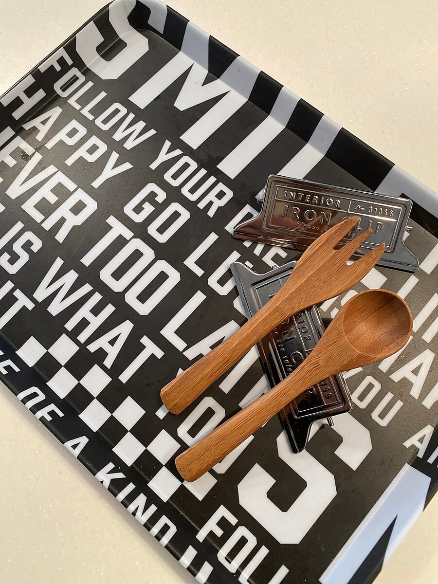 こちらのトレイを選んだ理由は、ズバリ、メラミン樹脂だという点。 歪みにくいんです。
