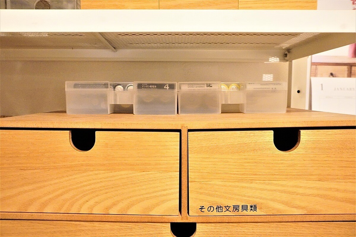 乾電池は、パソコンスペースの文房具棚の隙間に2つ並べて収納しています。